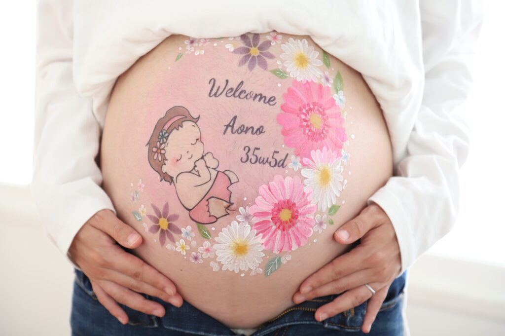 マタニティフォト・ベリーペイントギャラリー 2022年04月19日(火) エアブラシアートと手描きアートを組み合わせた春らしいデザインです♪ アートを始めるとお腹の中の赤ちゃんが元気よく動きだしていました!とっても神秘的ですね♪