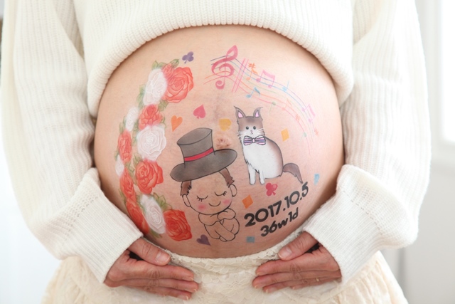 マタニティフォト・ベリーペイントギャラリー 2018年04月20日(金) 飼っている猫ちゃんと音楽がお好きなお二人で音符を入れました!マタニティフォトは夫婦二人の記念写真にもなりますね(^^♪ 無事ご出産されたようです(^^♪