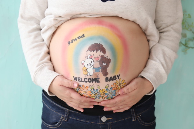 ベリーペイントはボディアート用の水性の絵の具で描くので、赤ちゃんは勿論お母さんの身体に害が無いので安心して楽しんで頂けます♪